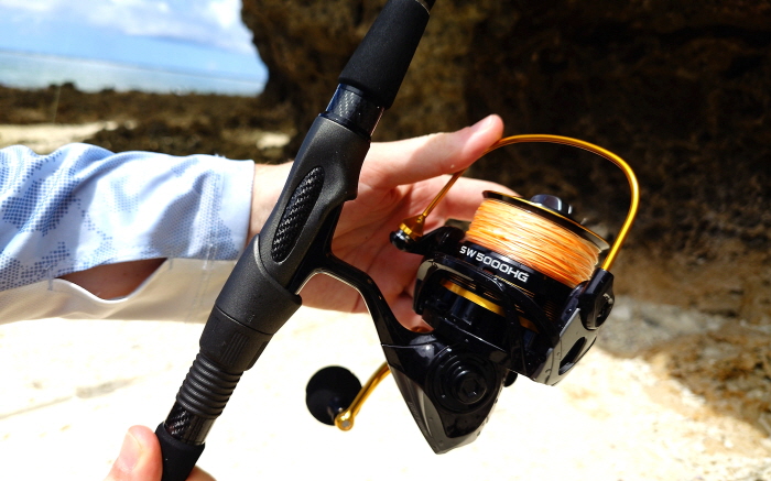 N.S 이그니션 SW 5000HG 릴에 PE 5 합사 라인, 90파운드 모노 리더를 조합한 세팅을 사용했다.