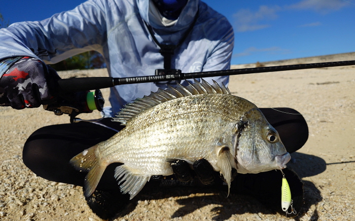 발목 깊이의 얕은 수심에서 톱워터 루어로 히트된 45cm 사이즈의 브림(감성돔).