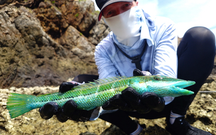 결국 원래 바늘에 걸렸던 놈을 끌어냈고 곧바로 꼬리를 붙잡아 갯바위 웅덩이로 옮겼습니다. 길이 69cm. 제 인생 첫 블루핀 트레발리였습니다. 루어 훅은 심하게 휘어 있었고 쇼크리더는 갯바위에 스쳐 완전히 닳아 있었습니다.