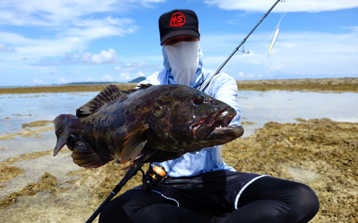 갯바위에서 큰 어종을 노리려면 썰물 최저 수위를 기다려야 합니다. 물이 충분히 빠지면 리프 끝 경사면까지 걸어 들어갈 수 있기 때문입니다. 계획은 단순했습니다. 큰 루어로 강한 소란을 일으켜 대형 어종을 끌어내는 것이죠.