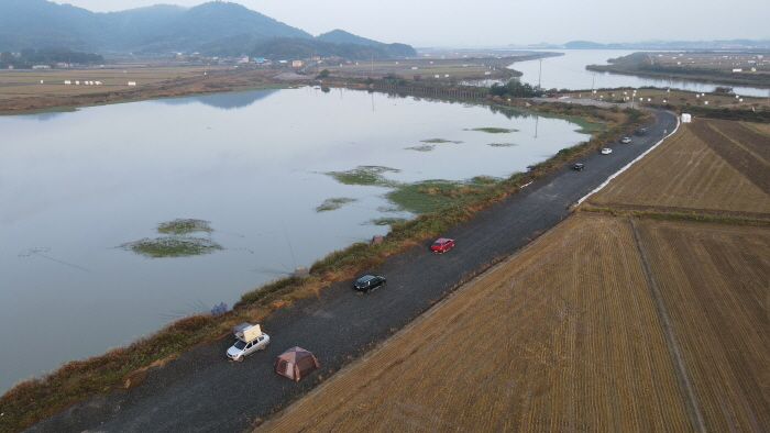 11월 8일, 행사 당일 학산천 동쪽에 도착해보니 포인트 바로 옆으로 폭 약 10m의 넓은 길이 나 있었고 그 위에 파쇄석이 깔끔하게 깔려 있었다. 연안에는 장박 텐트도 3동 있었고 물색도 좋았다. 도로 공사가 완전히 끝난 것 같지는 않았고 잠시 중단된 상태로 보였다. 파쇄석이 두껍게 깔려있기는 하지만 후륜 화물차나 바퀴가 작은 차는 자칫 빠질 수 있어 주의가 필요했다.