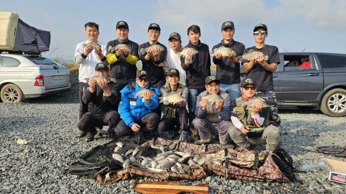 정출에 참가한 회원들이 조과를 들고 기념촬영을 하고 있다.