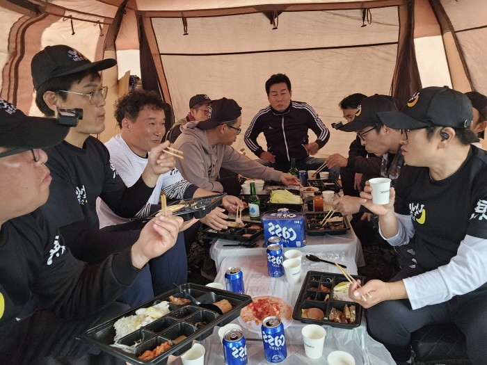 학산천에서 정출을 진행한 달빛서포터즈 회원들이 본부석에서 즐거운 시간을 보내고 있다.