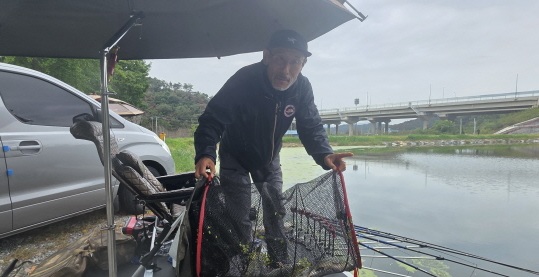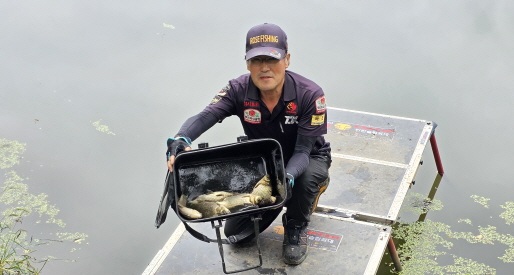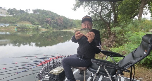 필자가 붕어를 방류하기 전에 조과를 보여주고 있다.