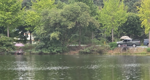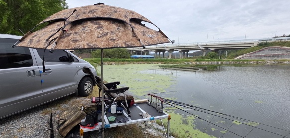 오후 2시경 저수지 답사를 마치고 하룻밤 낚시 장소인 관동지에 도착하였다. 먼저 도착한 두 회원이 낮낚시를 즐기고 있었다. 오후 3시경에 비가 소강상태로 접어들 때 쯤 서둘러 내려 대편성을 시작했다. 그러는 도중 또 비가 내렸다. 이 비가 과연 호재일지 악재일지 몰라 약간 걱정이 되었다.