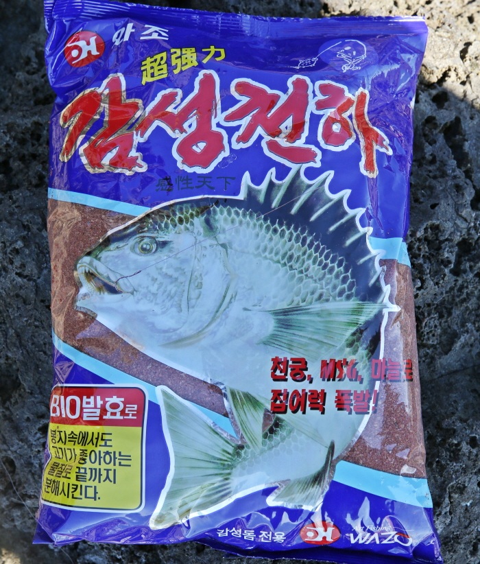 밑밥의 비중을 조절하기 위해 추가로 가져간 집어제. 압맥을 많이 섞는 경우 밑밥이 잘 뭉치지 않을 때 집어제와 물을 더 섞어 잘 뭉치도록 사용한다.