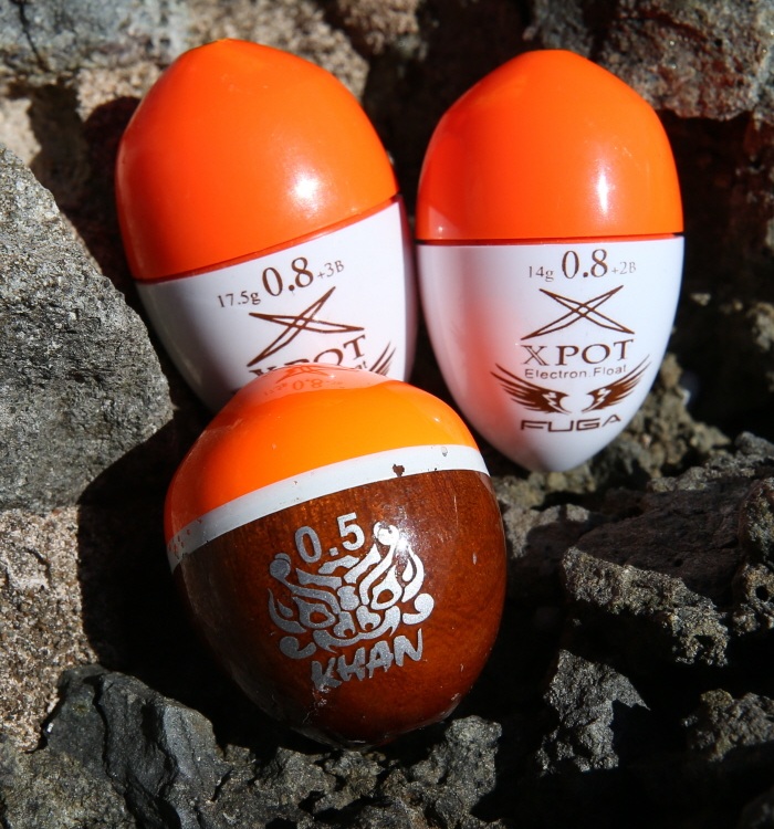 원투력이 뛰어난 푸가(위 2개) 전지찌와 칸 구멍찌. 조류가 약해 막대찌가 흘러가지 않을 때 효과적이다.