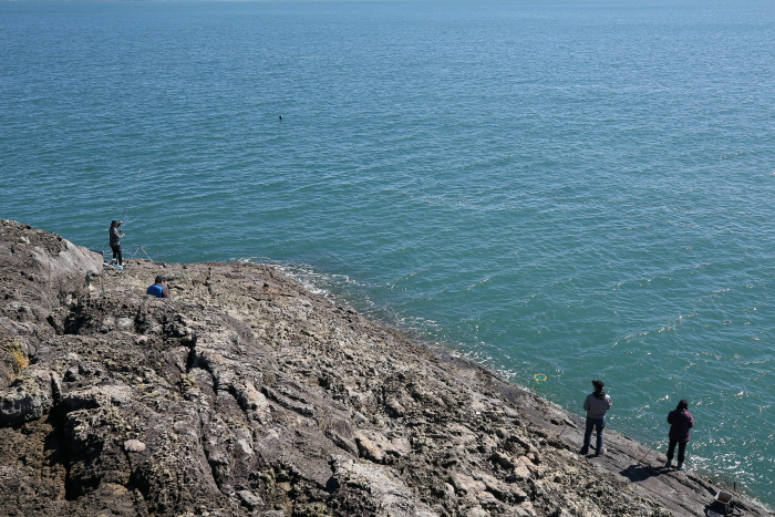 취재팀 옆에 선 낚시인들. 원투낚시, 민장대낚시 등 다양한 방법으로 낚시를 즐겼다.
