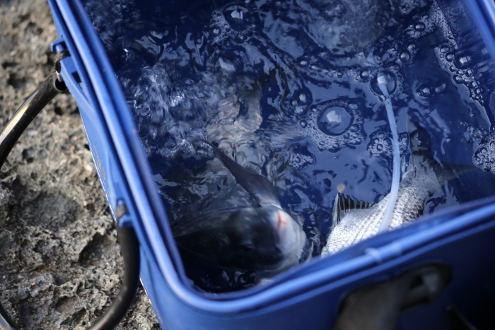 삼각여에 내린 낚시인의 라이브웰. 30cm급 감성돔이 2마리 들어있다.