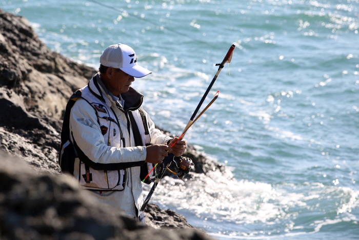 취재팀이 선 곳은 가천마을과 향촌마을 사이의 갯바위. 박현창 씨는 “11월부터 이듬해 1월 사이에 4짜~5짜 감성돔이 출현하는 유명한 곳입니다. 2호 내외의 자립 막대찌를 사용해 40m 정도 원투하면 입질을 받을 수 있습니다”라고 말했다.
