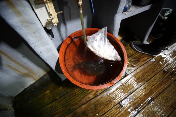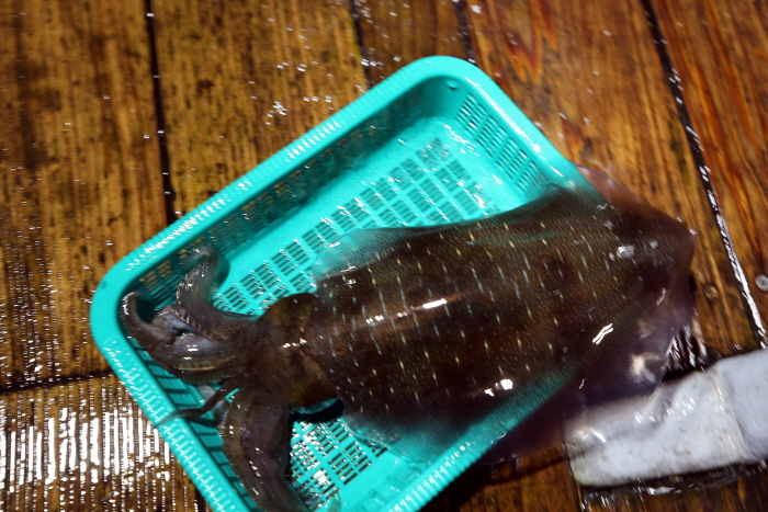 낚은 무늬오징어는 개인 살림통에 보관한다. 비닐봉투에 든 것은 문어.
