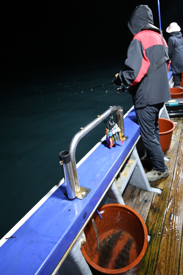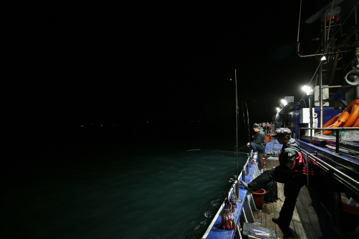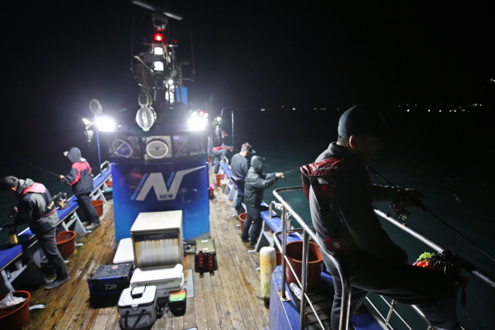 뉴그린피싱호를 타고 출조해 무늬오징어를 노리고 있는 낚시인들.