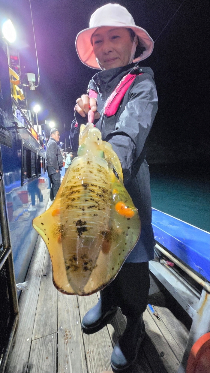 분홍색 팁런 에기로 킬로급 무늬오징어를 낚은 전하윤 씨.