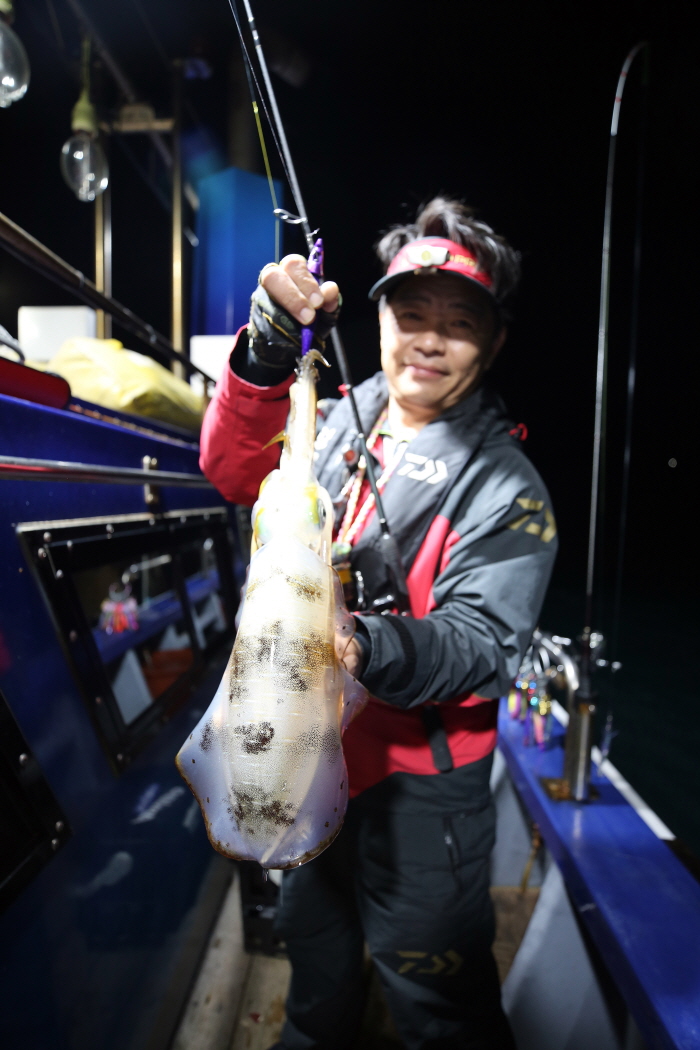 날씨가 나쁘고 에기 운영이 제대로 되지 않으니 조과가 좋지 않았다. 허형갑 씨가 킬로급 무늬오징어를 한 마리 올려 분위기 반전이 되나 했지만 큰 씨알은 그것이 전부였고 나머지는 대부분 500g 내외의 자잘한 씨알이 올라왔다. 새벽 1시까지 욕지도 주변을 탐색한 결과 대부분 한두 마리 조과에 그쳤고 다음을 기약할 수밖에 없었다.