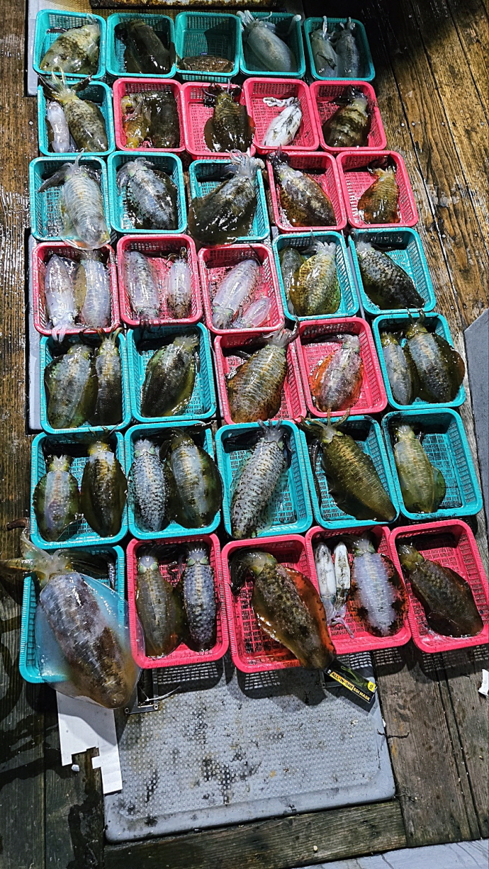 국도 상황은 좋았다. 조류가 잘 흘러가서 낚싯배의 흐름이 유지된 덕분에 두세 포인트를 훑으면 킬로급 무늬오징어를 만날 수 있었다. 단, 어제 기상 악화의 영향으로 물색이 조금 나쁘고 너울파도가 높아 절반이 넘는 포인트에 진입하지 못한 것이 아쉬웠다.