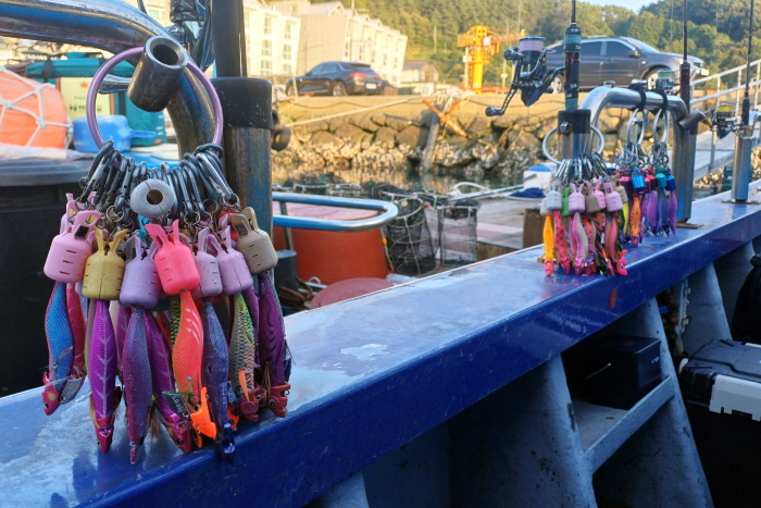 낚시인들이 준비한 팁런 전용 에기. 조류가 빨라 팁런 에기에 마스크를 씌웠다.