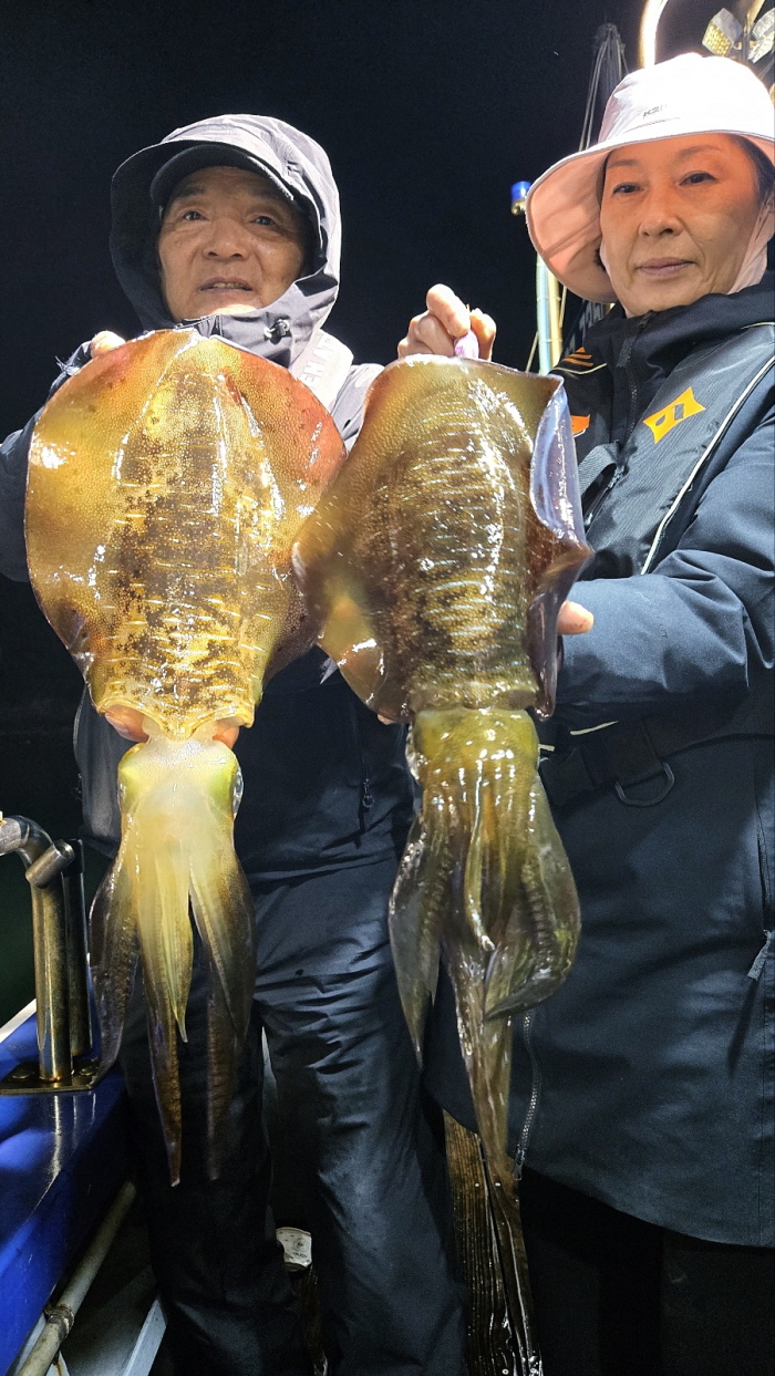 취재 이튿날 통영 국도 일원에서 킬로급 무늬오징어를 낚은 박종경(좌), 전하윤 씨.