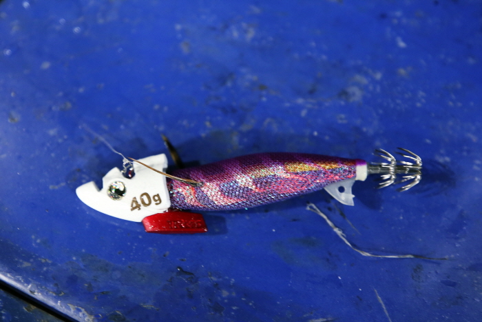 조류가 빠를 것에 대비해 야마시타 3.5호 팁런 에기에 40g 마스크를 씌웠다.