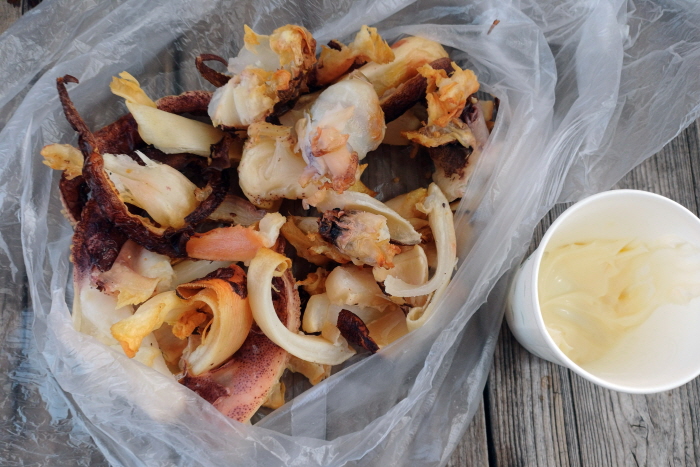 박종경 씨가 준비해온 무늬오징어 피데기. 작년에 낚은 2.5kg짜리 대형 무늬오징어로 에어프라이에 살짝 구운 것이다.