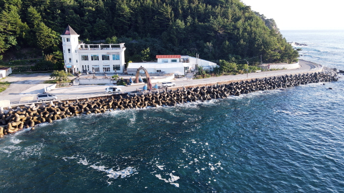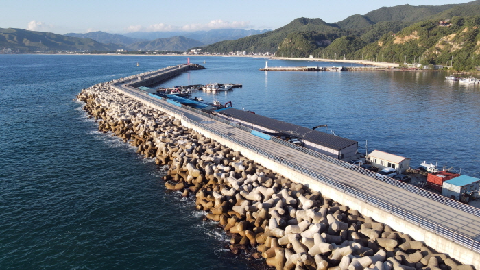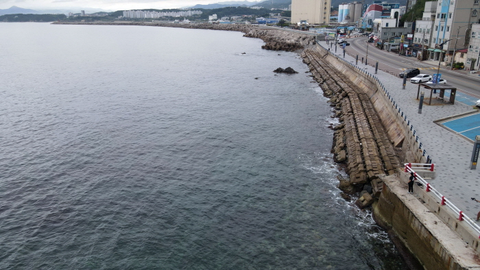 드론으로 촬영한 금진방파제 초입. 길게 늘어선 해안도로 테트라포드 주변이 포인트며 테트라포드 주변 지형이 복잡해 무늬오징어 은신처가 많다.
