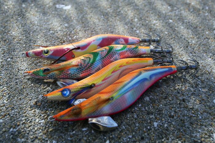 오렌지 컬러 에기. 자세히 보면 비슷한 오렌지 컬러라도 속지가 다른데, 이점을 이용해 로테이션하면 빠르게 입질 패턴을 찾을 수 있다.
