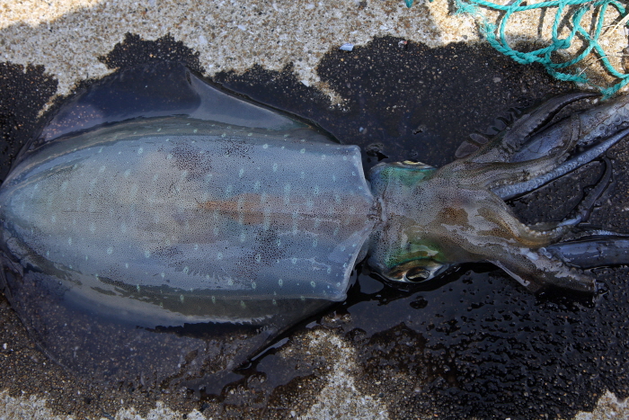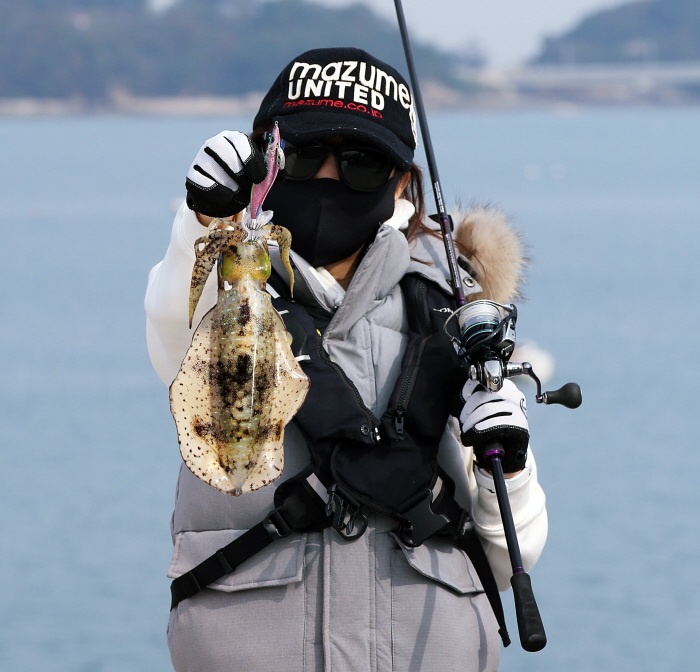 수심은 5m로 깊지 않아 3호~3.5호 섈로우 타입의 에기를 사용, 첫 캐스팅에 문현중 씨가 300g 무늬오징어를 낚아냈다. 운이 좋으면 마릿수 조과를 거둘 수 있을 것이라는 예감이 들었고 모두 힘차게 로드를 흔든 결과 내가 1마리, 함께 출조한 박희은 씨가 1마리를 낚았다. 생각과 달리 마릿수 조과로 이어지지 않았는데, 그 이유는 우리가 금진방파제에 도착하기 전에 이미 한두 차례 낚시인들이 드나들었기 때문이라고 했다. 그러고 보니 테트라포드 사이 위에 무늬오징어 먹물자국이 여러 곳에 있었고 아직 마르지 않은 상태였다.