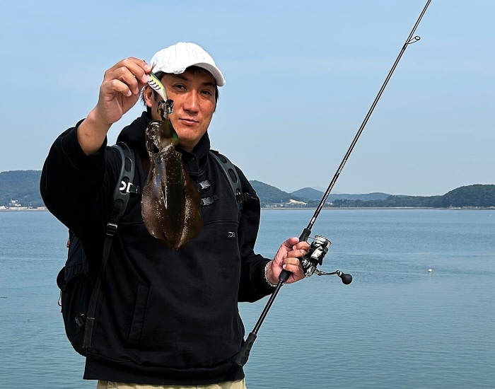 고구마급 씨알의 무늬오징어를 낚은 기자.