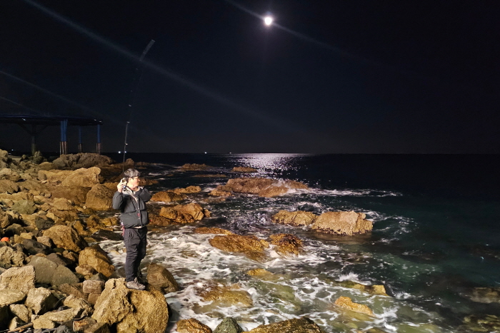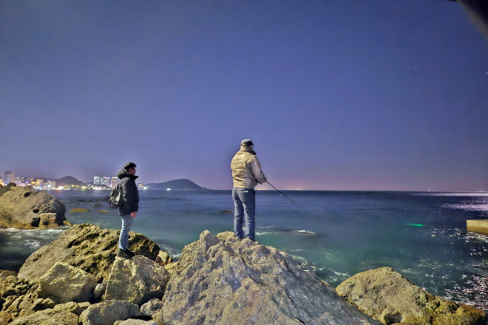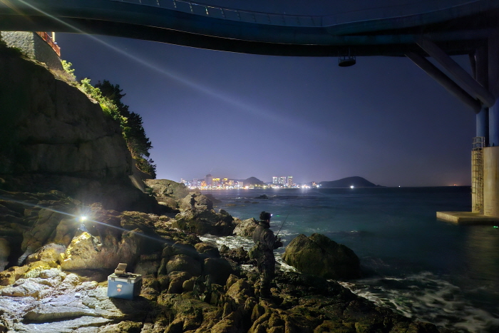 지난 1월 1일, 부산 청사포 다릿돌전망대 아래로 출조한 여용군 씨가 갯바위에서 교각 주변을 노리고 있다.