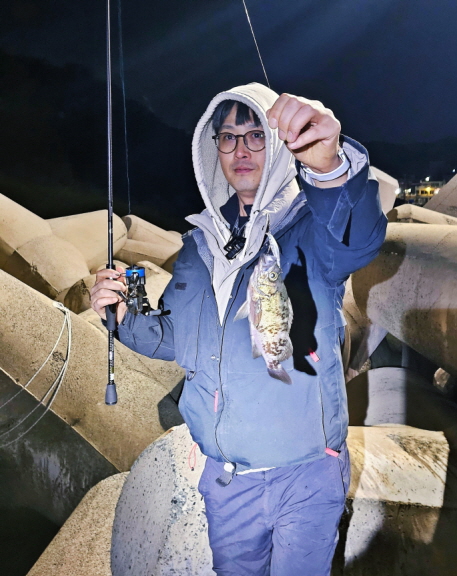 여용군 씨가 해안 테트라포드 주변에서 하드베이트로 씨알 굵은 볼락을 보여주고 있다.
