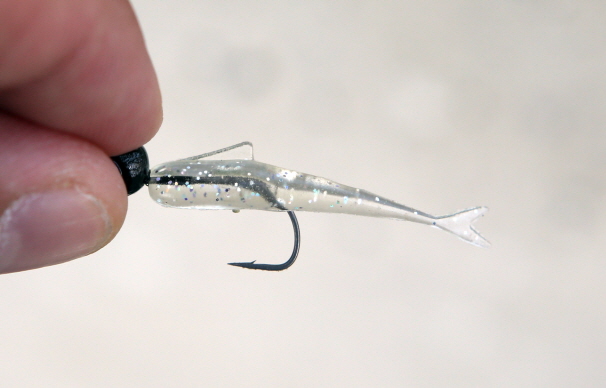 투명 컬러 웜. 작은 베이트피시가 있는 상황에서 잘 먹힌다.