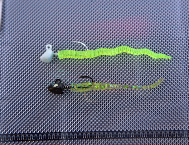 2g 지그헤드에 체결한 스트레이트 웜. 꼬리가 길어 폴링할 때 자연스러운 액션 연출이 가능하다.