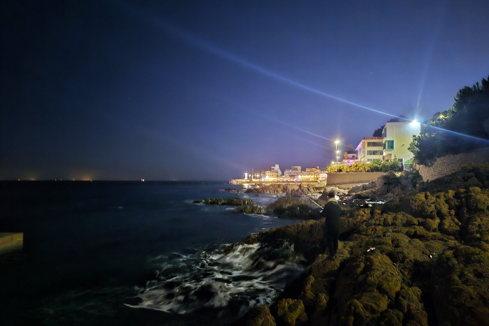 여용군 씨는 “북풍이 지속적으로 부니 차라리 동해남부권으로 이동하시죠. 부산 청사포나 해운대는 바람을 피할 곳이 있을 듯합니다”라고 말했다. 우리는 거가대교를 건너 명지→하단→영도→광안리→해운대를 거쳐 부산 청사포에 도착했다. 꽤 멀다 생각했지만 유료도로를 이용하니 1시간 남짓 걸렸다. 여용군 씨가 낙점한 자리는 청사포 갯바위와 바로 옆에 있는 다릿돌전망대. 전망대 뒤로 언덕이 있어 북풍을 피할 수 있었고 해가 진 후라 관광객이 없어서 곧장 포인트로 내려갈 수 있었다.