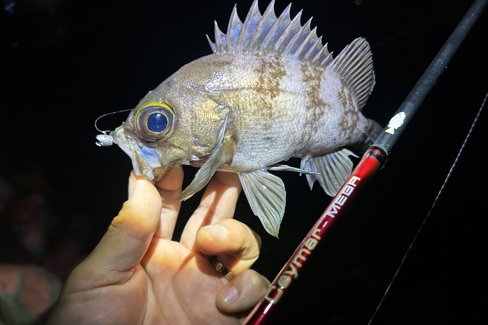 기자가 낚은 씨알 굵은 볼락. 사용한 로드는 오쿠마 세이마르 메바.