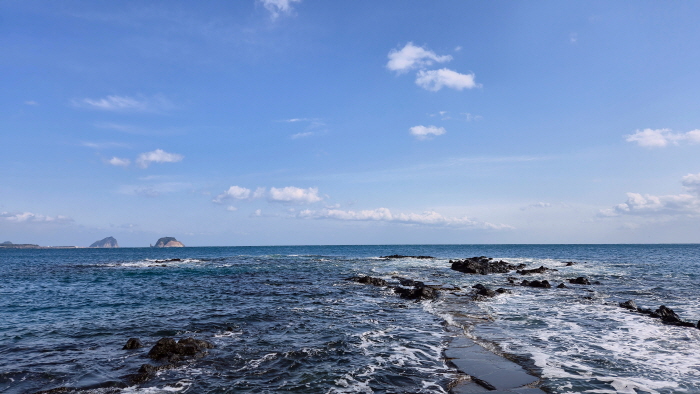 서귀포 강정 갯바위에서 바라본 문섬. 문섬 왼쪽은 새섬이다.