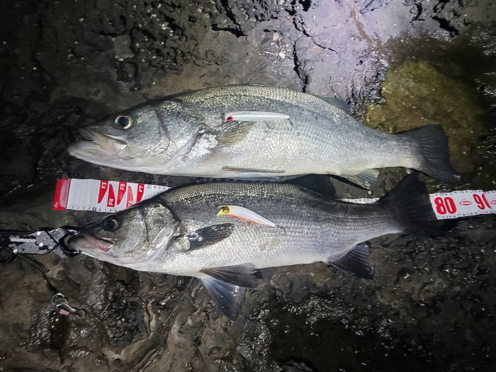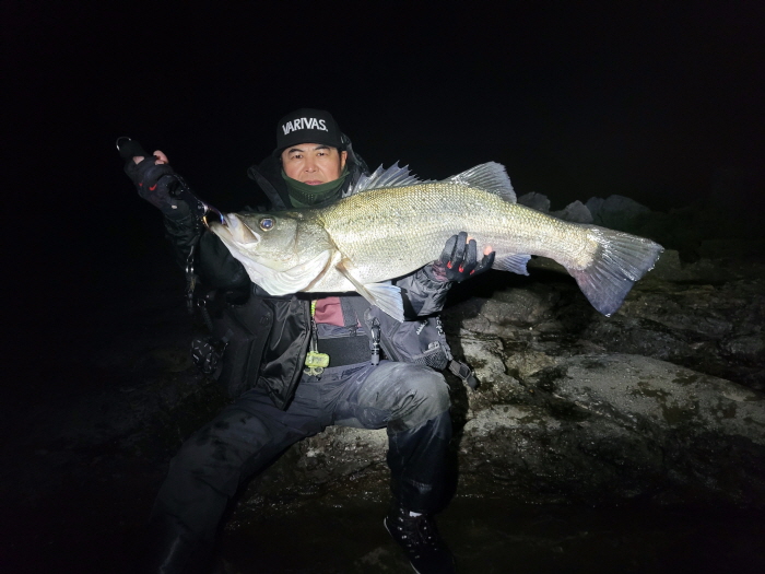 20분 정도 캐스팅을 했을까? 이곳은 아주 얕은 구간으로 수심은 70cm 정도 된다. 낮에는 바닥이 보일 정도로 얕은 곳이지만 이곳에서 다시 입질을 받았다. 아마 해가 진 후 멸치를 쫒아 넙치농어가 들어온 듯했다. 이번에는 김도윤 씨가 넙치농어를 잘 마무리했고 계측하니 81cm가 나왔다.