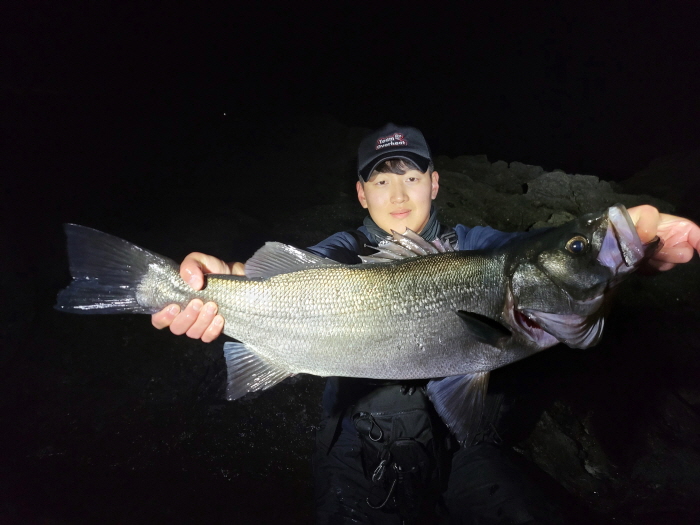 서귀포 강정 갯바위 초입에서 81cm 넙치농어를 낚은 팀루어테크 김도윤 회원.