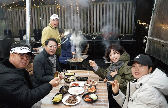 직접 낚은 회와 삼겹살로 즐거운 식사를 즐기는 가족 낚시인들.