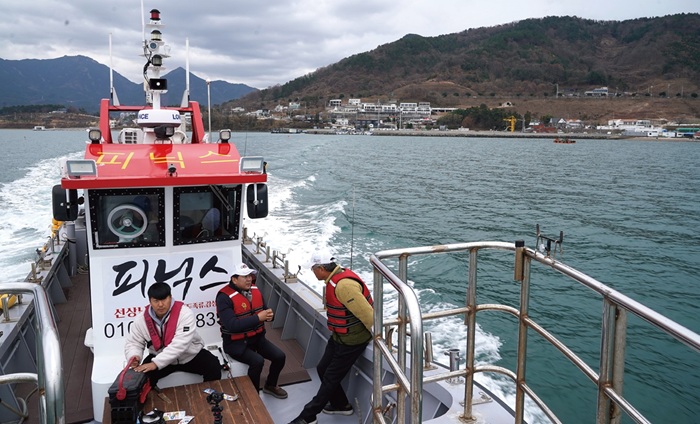 체험 배낚시에 나선 가족 낚시객이 삼천포마리나펜션에서 운영 중인 낚싯배를 타고 포인트로 향하고 있다.