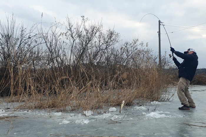 배스가 낚인 구멍에서는 또 배스가 나올 확률이 크다. 오랜 경험을 통해 체득한 사실이다. 이번에도 역시 그럴 것이라 예상했다. 배스가 낚인 구멍은 갈대 군락이 밀생한 곳이었는데, 배스는 밀생한 수초대에 있다는 것을 예상할 수 있는 부분이었다. 그러나 배스의 추가 입질은 없는 채 시간만 흘렀다. 그러는 동안 나는 틈틈이 얼음 구멍을 추가 확보해두었다.