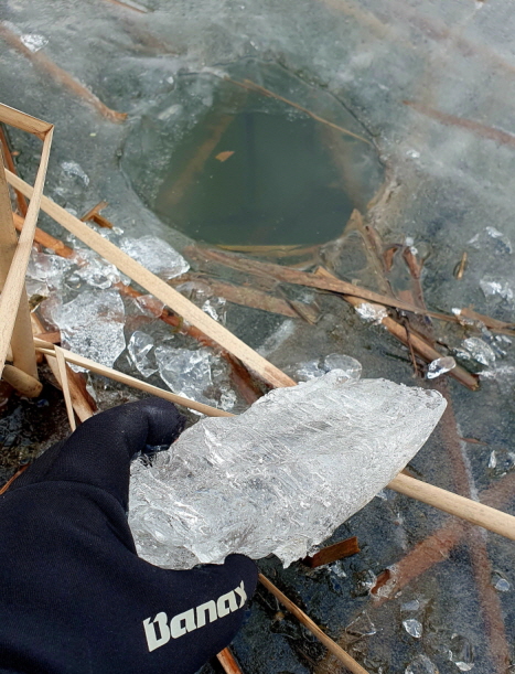 얼음판에 오르기 전에 얼음끌을 수로 가장자리에 내리쳐 빙질을 확인했다. 다행히 얼음 두께가 7cm 정도였는데 영상의 기온이라 빙질은 좋지 못했다. 처음 진입한 곳은 부들군락이 있는 곳. 부들 가장자리에 구멍 6개를 뚫었다. 지금까지 경험으로는 얼음을 뚫은 직후에 채비를 넣어도 가끔 입질을 한다는 것이다. 오늘도 그럴 수 있다 생각했다. 그러나 쉽게 들어오지 않는 입질. 오후 6시면 해가 지기 때문에 점점 초조해졌다.