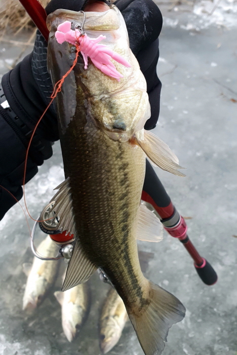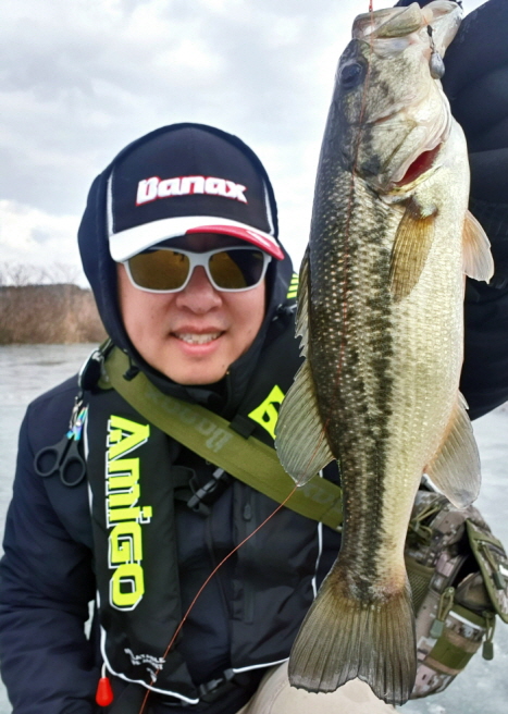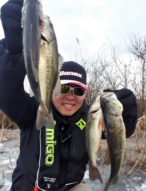 “올겨울 최고 호황인 거 같습니다.” 필자가 대요수로 얼음낚시에서 낚은 배스를 보여주고 있다.