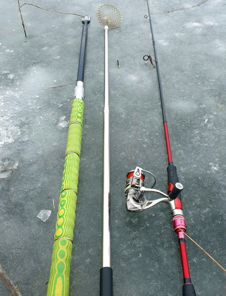 필자의 배스 얼음낚시 장비. 좌측부터 얼음끌, 얼음뜰채. 바낙스 엑시마 콤파스 더 레드 배스 로드.
