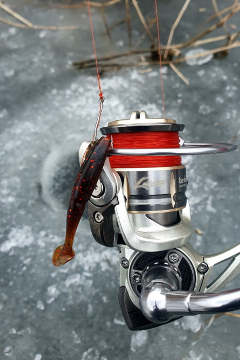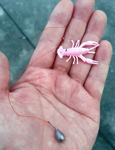 얼음구멍에 넣어 고패질 하기 쉬운 드롭샷리그. 1.5인치 분홍색 가재웜(Kgood - yabbi)을 사용했다.