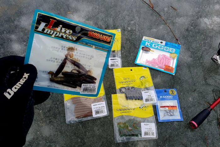 드롭샷리그에 사용한 웜. 손에 든 웜은 배스랜드 2인치 섀드웜이다.