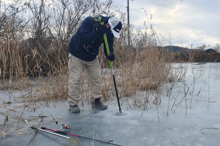 취재지로 선정한 곳은 대호의 대요수로. 초겨울에 배스를 확인한 곳이라 충분히 가능성이 있다고 판단했다. 포인트에 도착한 시각은 오후 3시. 서둘러 얼음 확인을 위해 물가로 달려갔는데, 겨우 얼음을 탈 수 있는 두께임을 확인하고 안도했다. 그렇게 왼손에는 장비를 들고, 오른손엔 얼음끌을 들고 조심스레 얼음판에 올랐다.