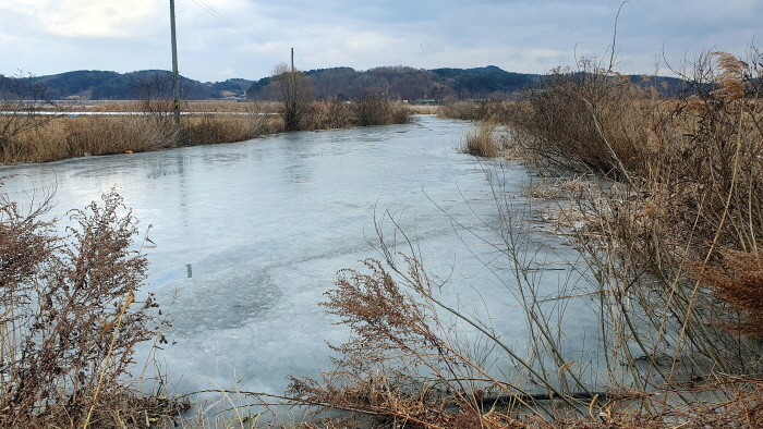 수면이 얼어붙은 대요수로. 수초군락 주변이 포인트다.