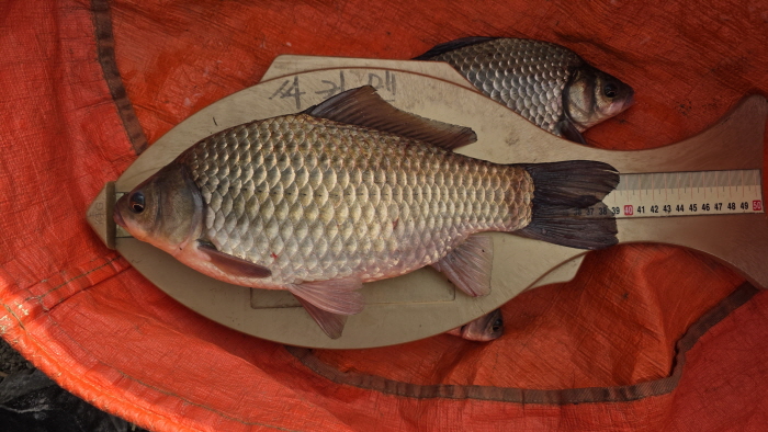 새벽 동이 틀 무렵 옆자리의 강민승씨 자리에서 날카로운 챔질 소리가 들렸다. 큰 물소리가 나며 대물 붕어가 나오는 것 같았다. 잠시 후 물 위에 떠오른 붕어는 4짜로 보였다. 어렵게 올라온 붕어는 39.5cm! 아침 낚시가 잘된다고 했던 전기훈 씨는 준척급을 한 수 낚았다.