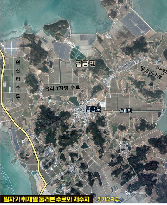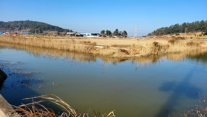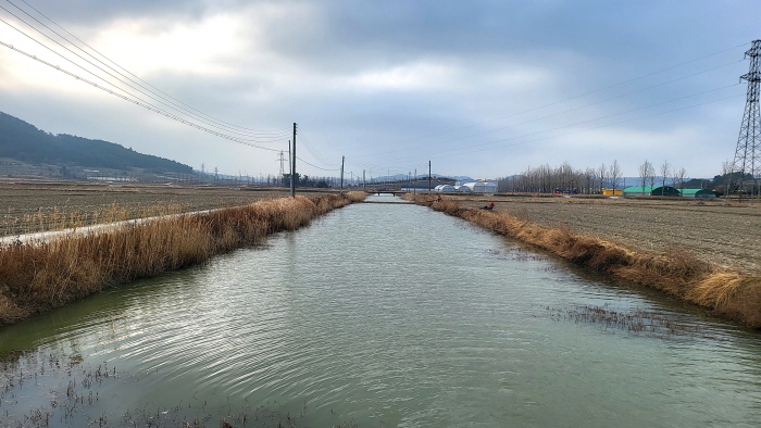 마지막 네 번째로 당고리에 형성된 당고리수로를 둘러봤다. H자 형태의 수로로 바닷가 연안 둠벙과 연결돼 있다. 전체적으로 폭은 약 13m, 상류 길이 약 160m, 하류 길이 약 340m, 상류와 하류 사이의 수로 길이는 약 430m였다. 수심은 약 80cm 정도를 유지하며 물색도 좋았다.