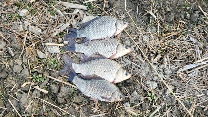 이른 아침에 온 몇몇 꾼들도 둠벙에 자리를 잡고 대를 펼쳤으나 이내 강풍을 이기지 못하고 대를 접는 모습이 시야에 들어왔다. 철수길에 원산리수로를 들러 어제 만난 광주꾼들의 조과를 확인한 결과 잔 씨알부터 턱걸이까지 살림망 가득 차 있었다. 두 곳 수로 모두 신안군의 낚시금지 기간 동안 어자원이 잘 보존된 것이 이유 같았다. 새벽을 제외하고 해질녘부터 자정 무렵, 이른 아침까지 붕어 입질이 이어졌고 지렁이 미끼를 사용한 수초 공략이 주효했다.