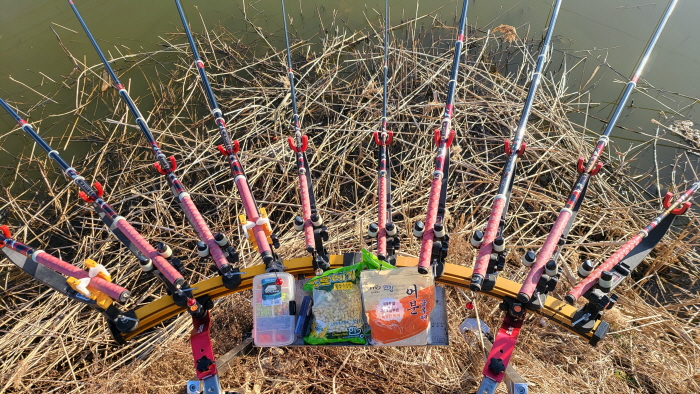 당고리수로 역시 텅 빈 수로였으나 이상하게 피부에 와 닿는 분위기는 포근했다. 다시 한 번 연안을 둘러 본 후 하류 끝의 합류지점에 자리를 잡았다. 논쪽 연안은 차량 통행과는 무관하게 주차할 수 있는 포인트였다. 3칸 대에서 4칸 대까지 총 10대를 편성하여 맞은 편 연안 수초대 언저리에 찌를 세웠다. 입질이 미약할 것을 대비해 굵은 지렁이를 한 마리씩 꿰어 입질을 체크했다.